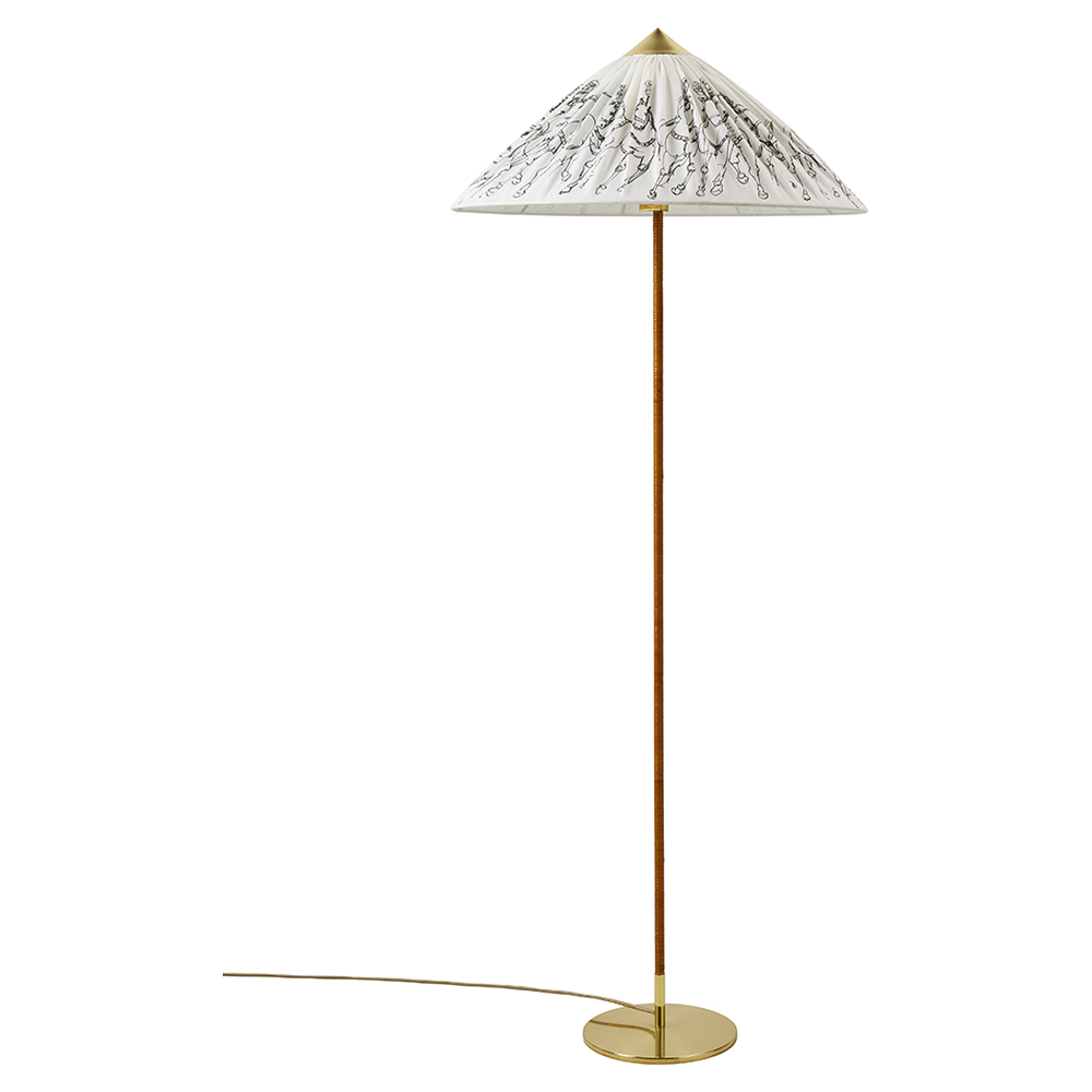 The Finnish lighting designer Paavo Tynell created the 9602 floor lamp in 1935 for the Hotel Aulanko located in Hameenlinna, Finland. The lamp is characterized by a wide shade resembling a traditional Chinese hat, and a slim, rattan-covered stem, contrasted with shiny brass in the base and on top of the lamp shade. The 9602 lamp is a fine example of Tynell's ability to turn illumination into art and combine different materials seamlessly. The luminaire is part of the Paavo Tynell collection released in 2018 for Gubi.