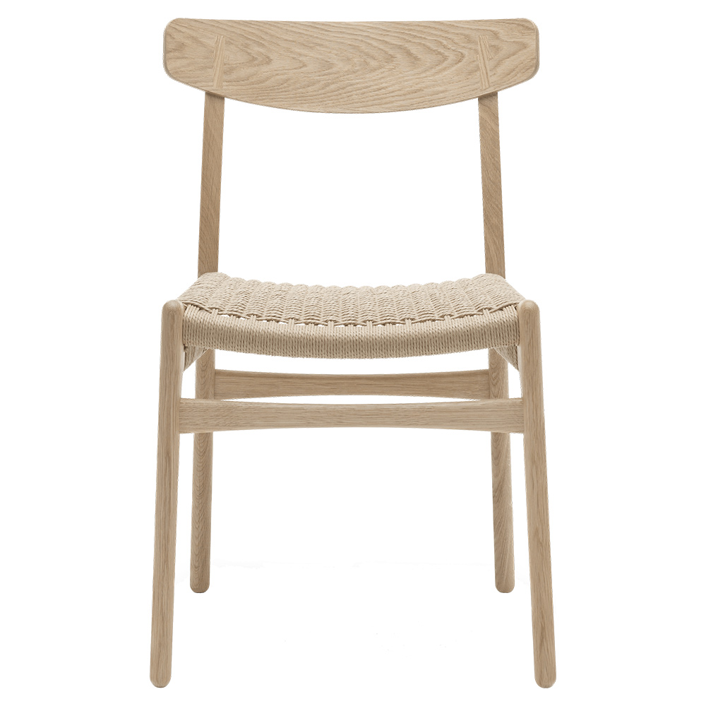 First introduced in 1950, the CH23 dining chair features organic contours and a clean expression, demonstrating the young Hans J. Wegner's unique design approach and insightful craftsmanship. Although the CH23 chair may appear uncomplicated at first glance, it incorporates many fine, sophisticated details, among them the elegant cruciform cover caps in the backrest, a unique hand-woven seat and backward arching rear legs that ensure optimal stability.