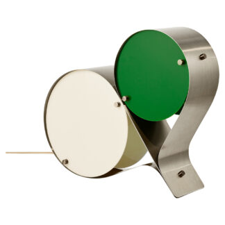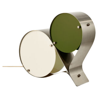 Named for the Italian word for 'couple', the Coppia Table Lamp by Vibeke Fonnesberg Schmidt walks the line between design and sculpture. Featuring two discs of Fonnesberg Schmidt's signature plexiglass housed in a curving metal case, the elegantly industrial design represents both a new material and a new designer for GUBI. The fluid yet geometric design is sturdy enough to be used as either a table or floor lamp, moving easily from desktop to bedside, shelf to windowsill as desired. Coppia Table Lamp is available in tempered, brushed stainless steel; its bronze glow contrasting with a choice of three nature-inspired plexiglass colorways: Ivory/Blush, Ivory/Olive, and Ivory/Clover.