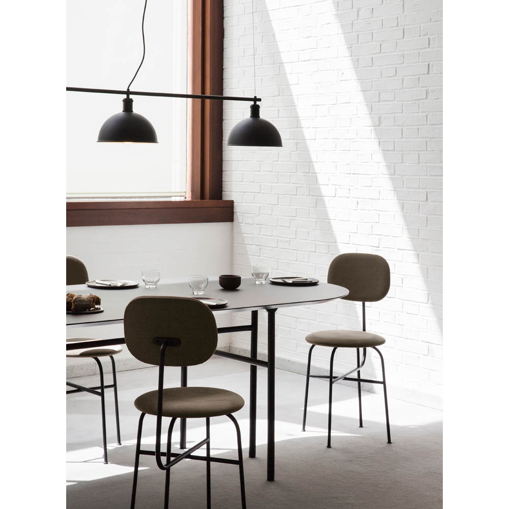 The Afteroom Dining Chair Plus elevates mealtimes to a new level of luxury with its upholstered seat and back, customizable in fabric to suit design and space preferences. A minimalist design offering maximum comfort, its tubular powder coated steel frame ensures durability and stability while the large, extended backrest provides lumbar support when seated for extended periods. Its streamlined silhouette, pared back to only the essentials, ensures it fits seamlessly into any setting.