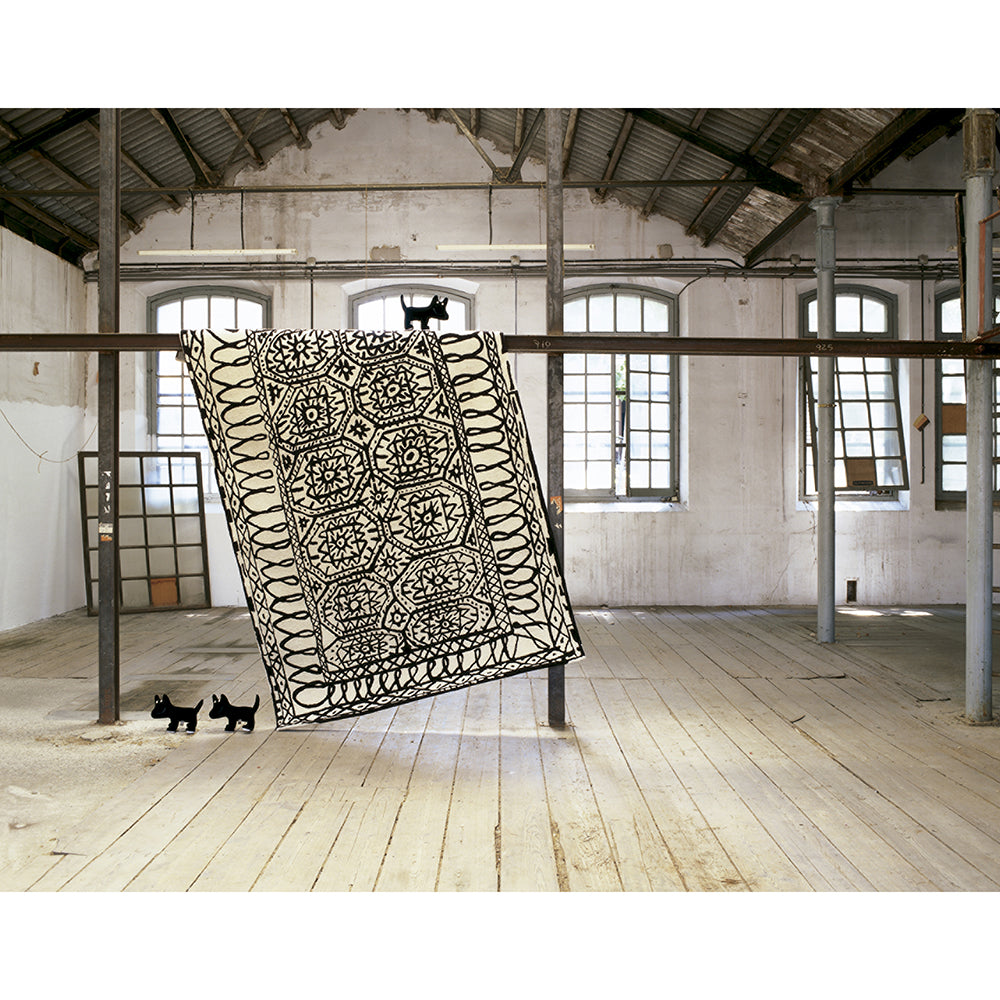 The original sketch for this rug was a watercolor painted by Javier Mariscal in 1987. The design transmits the basic outline of the classic Persian rug. Using this concept as a starting point, the design is updated using unique patterns reminiscent of comics, synthesizing East and West, placing traditional craftsmanship and contemporary design in one product.