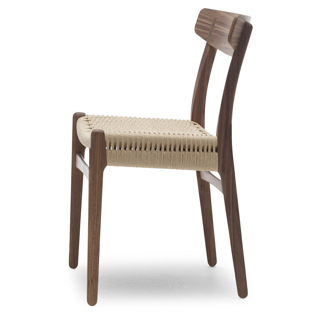 First introduced in 1950, the CH23 dining chair features organic contours and a clean expression, demonstrating the young Hans J. Wegner's unique design approach and insightful craftsmanship. Although the CH23 chair may appear uncomplicated at first glance, it incorporates many fine, sophisticated details, among them the elegant cruciform cover caps in the backrest, a unique hand-woven seat and backward arching rear legs that ensure optimal stability.