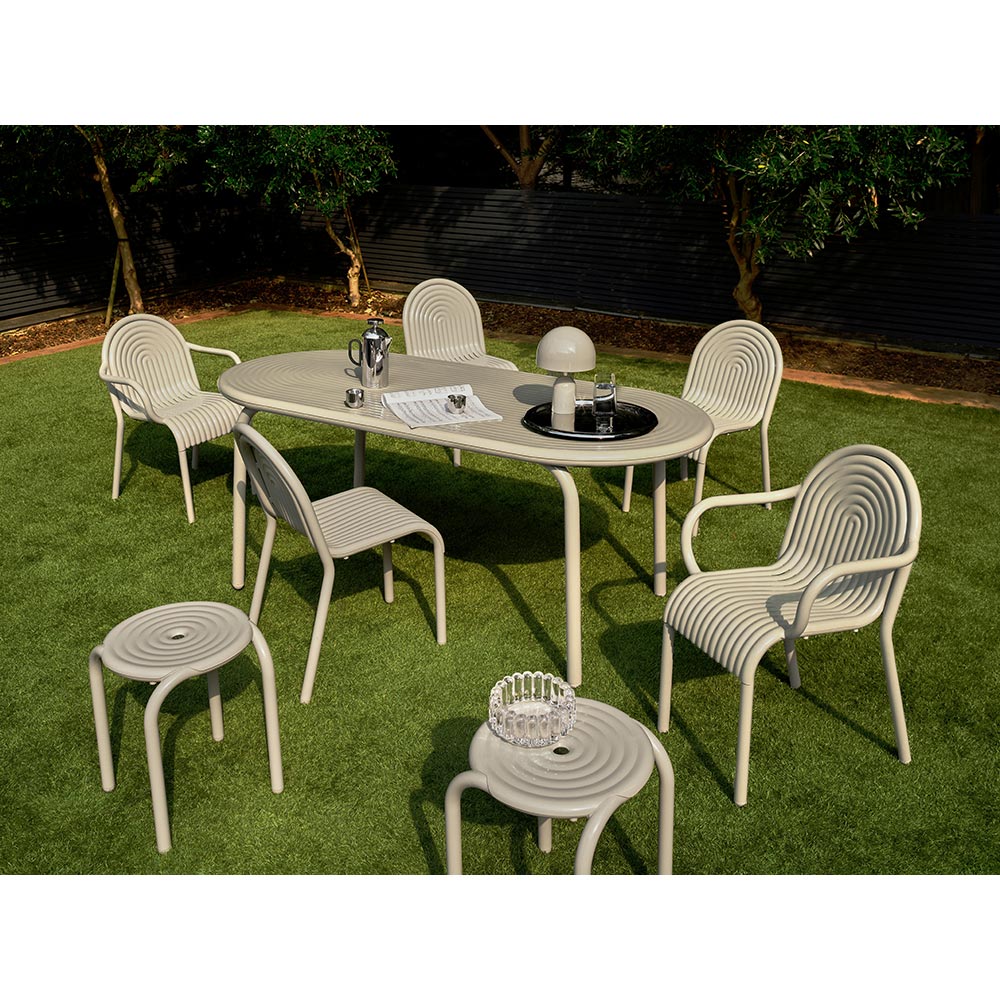 Groove, Tom Dixon's highly anticipated outdoor collection is a family of furniture that's been more than 10 years in the making. Crafted from durable aluminum, Groove is corrosion-resistant and built to withstand all weather conditions. The collection, with its distinctive art-deco inspired ridges, is available in two shades - Moss and Putty - designed to offer timeless elegance that fits effortlessly into any outdoor setting.