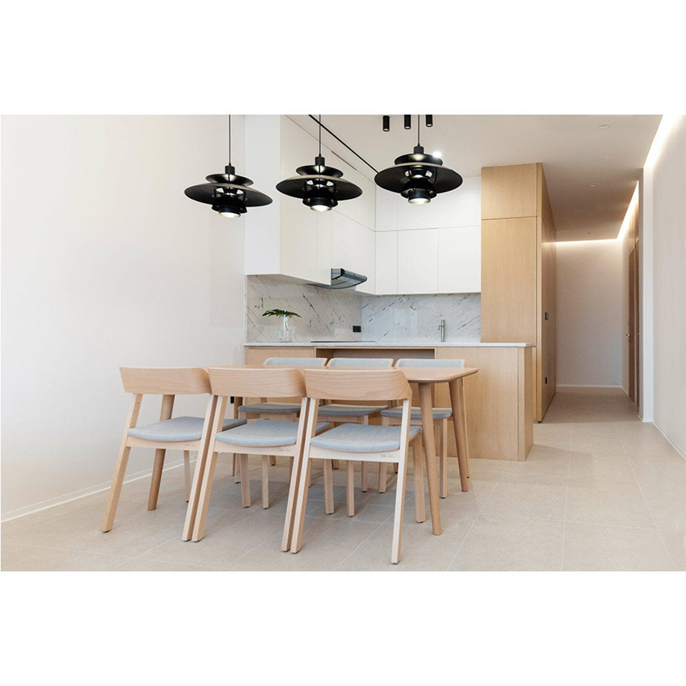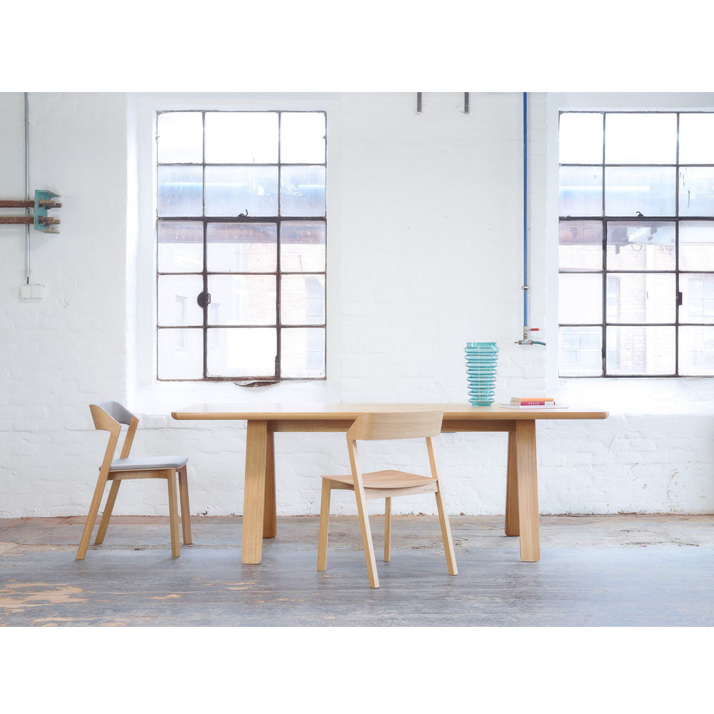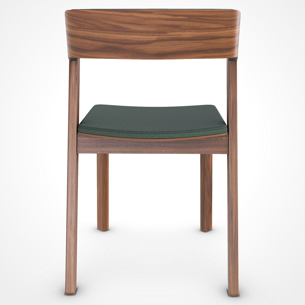 The Upholstered Merano Chair combines a solid wood lower structure with harmonic curves of molded plywood seat and armrests. Available in several wood and fabric options.