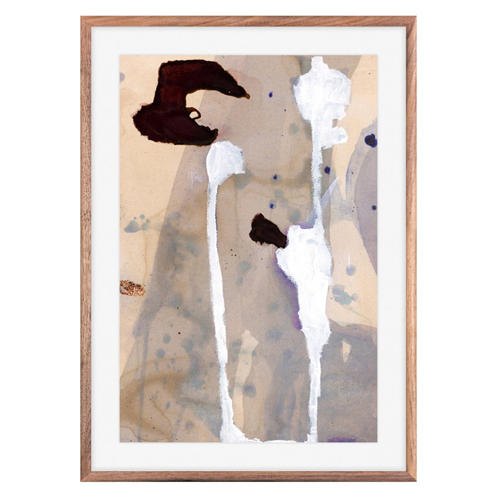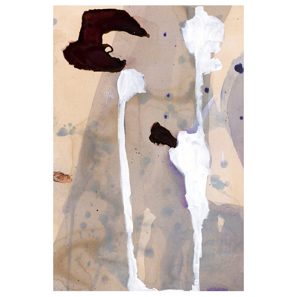 Mori Falls is part of an abstract landscape painting series honoring far away lands with delicate, transparent washes and rivulets of soft mauve, tea, and sand layered by gestural swaths of burnt umber.
