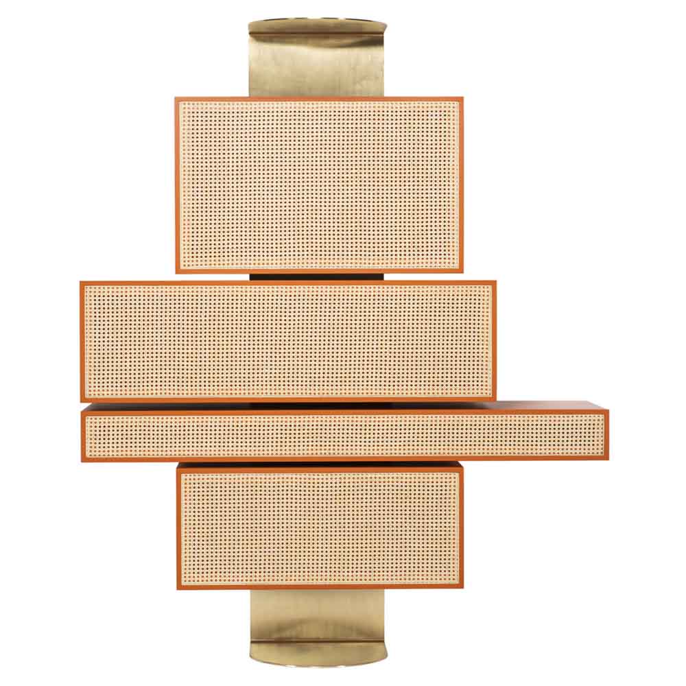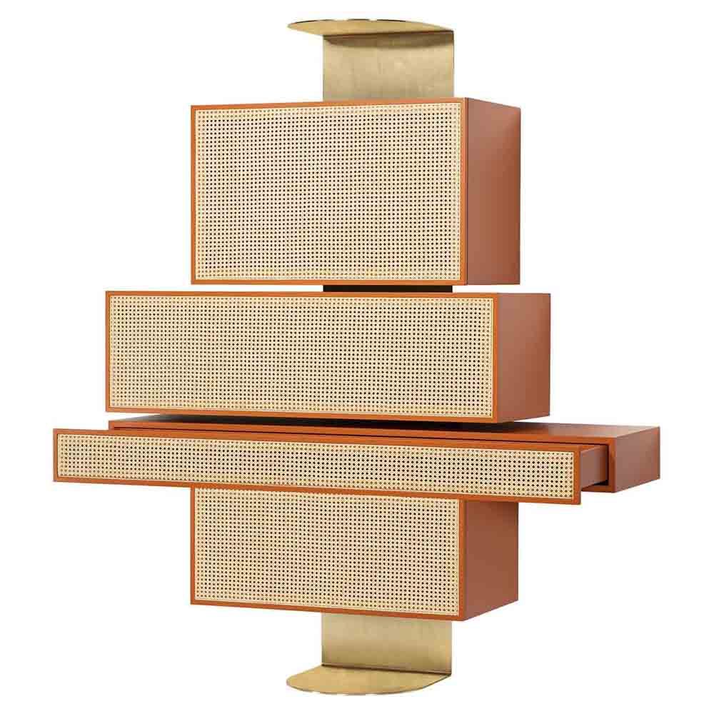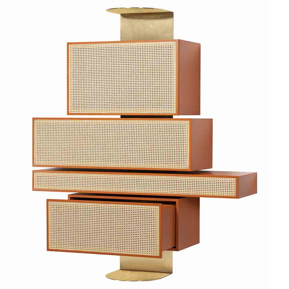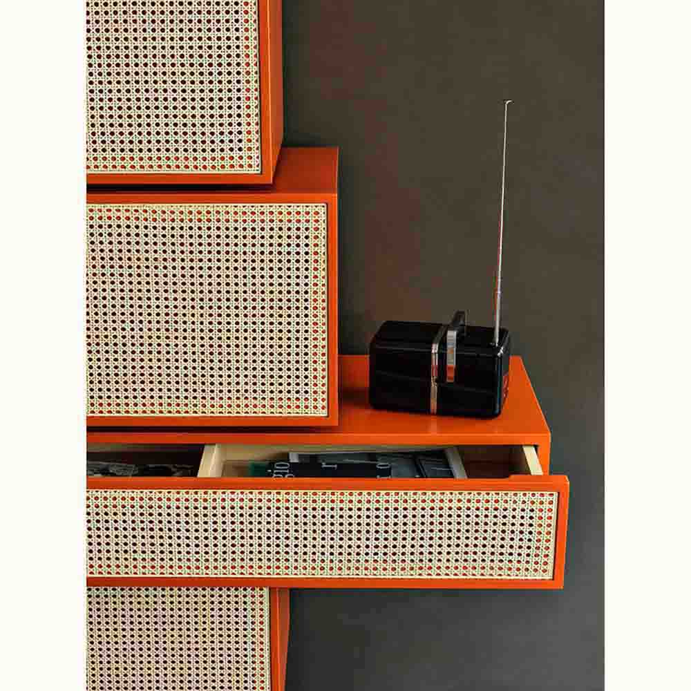 Distinctively asserting its modernity, Gebruder Thonet Vienna has adopted its archetypes, bent wood and woven cane, to design NYNY Unit, a piece of furniture with a strong emotional dimension capable of imposing itself in space as the absolute protagonist of the scene. With its versatile personality, this multifaceted design by storagemilano expresses an interdependence of design, architecture and art that draws inspiration from both the typical post-modernist styles and the graphic playfulness of the 1980s while creating an irregular development of perspective accentuated by the intense color scheme. The reference to architecture is also reflected in the name NYNY as New York, New York. The play of volumes of NYNY Unit is, in fact, a tribute to the New Museum of Contemporary Art in Nolita, whose building expresses the archetypal forms of the Babylonian ziggurat. With a totemic spirit, NYNY Unit is defined in the asymmetrical superimposition of geometric volumes suspended with the support of the wall-mounted metal structure. Each volume corresponds to a specific function: below, two drawers, one high and one low; above, two compartments with doors; the lower one can also be used as a desk.