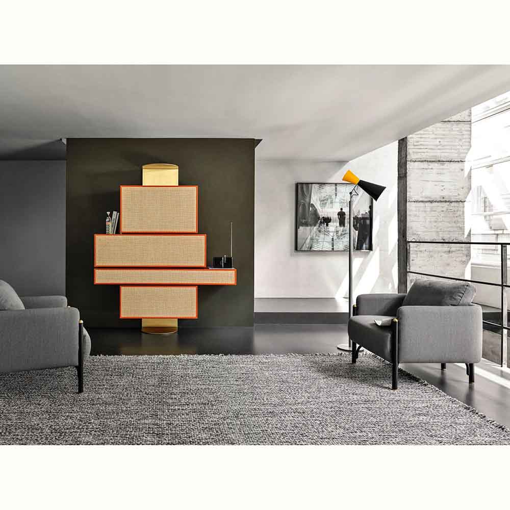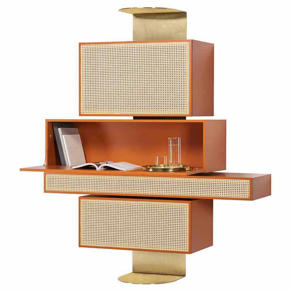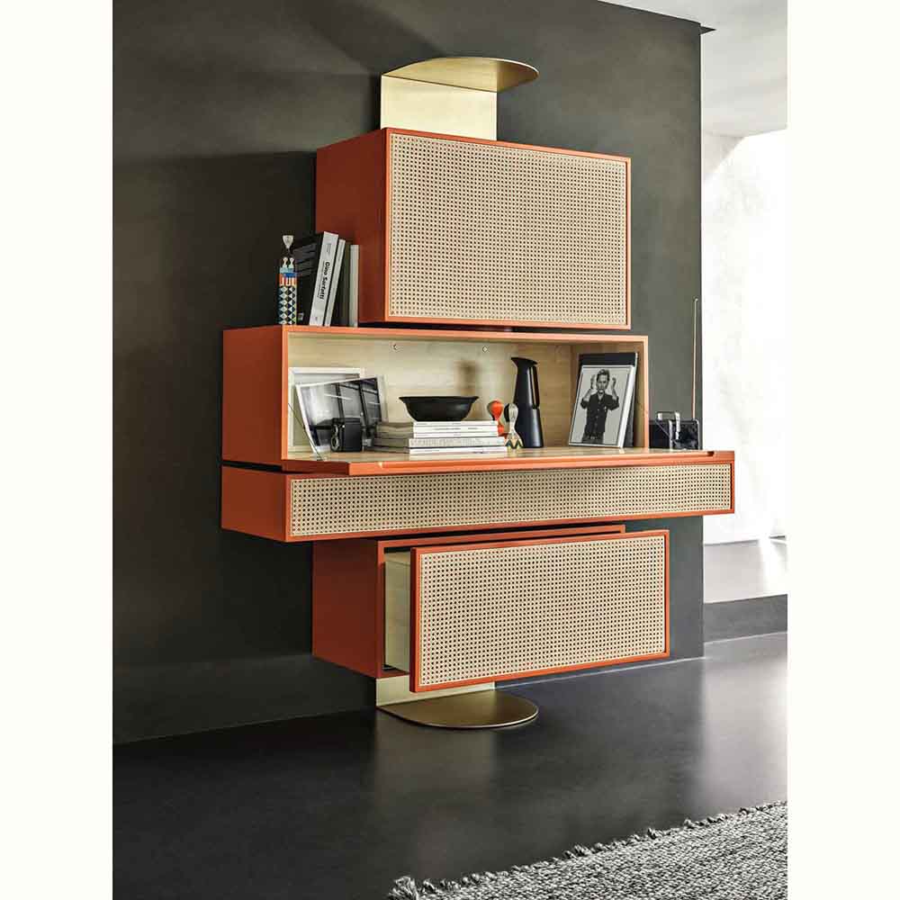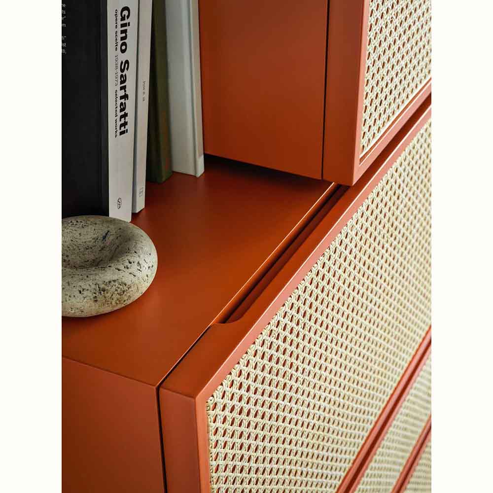 Distinctively asserting its modernity, Gebruder Thonet Vienna has adopted its archetypes, bent wood and woven cane, to design NYNY Unit, a piece of furniture with a strong emotional dimension capable of imposing itself in space as the absolute protagonist of the scene. With its versatile personality, this multifaceted design by storagemilano expresses an interdependence of design, architecture and art that draws inspiration from both the typical post-modernist styles and the graphic playfulness of the 1980s while creating an irregular development of perspective accentuated by the intense color scheme. The reference to architecture is also reflected in the name NYNY as New York, New York. The play of volumes of NYNY Unit is, in fact, a tribute to the New Museum of Contemporary Art in Nolita, whose building expresses the archetypal forms of the Babylonian ziggurat. With a totemic spirit, NYNY Unit is defined in the asymmetrical superimposition of geometric volumes suspended with the support of the wall-mounted metal structure. Each volume corresponds to a specific function: below, two drawers, one high and one low; above, two compartments with doors; the lower one can also be used as a desk.