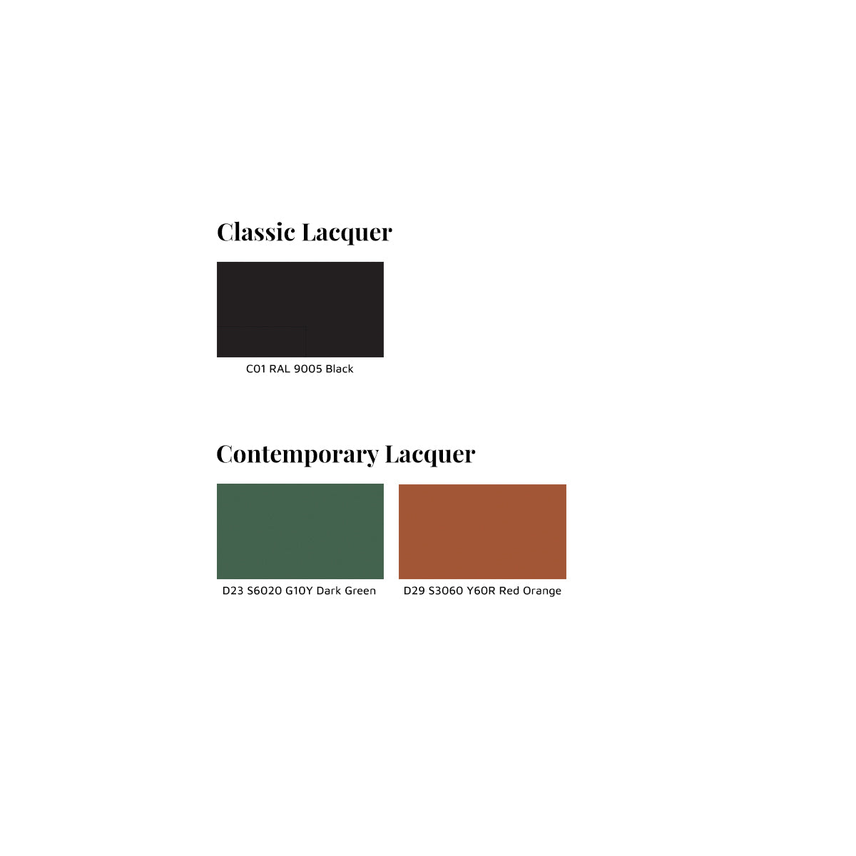 - Available finishes: Classic lacquer, Contemporary lacquer