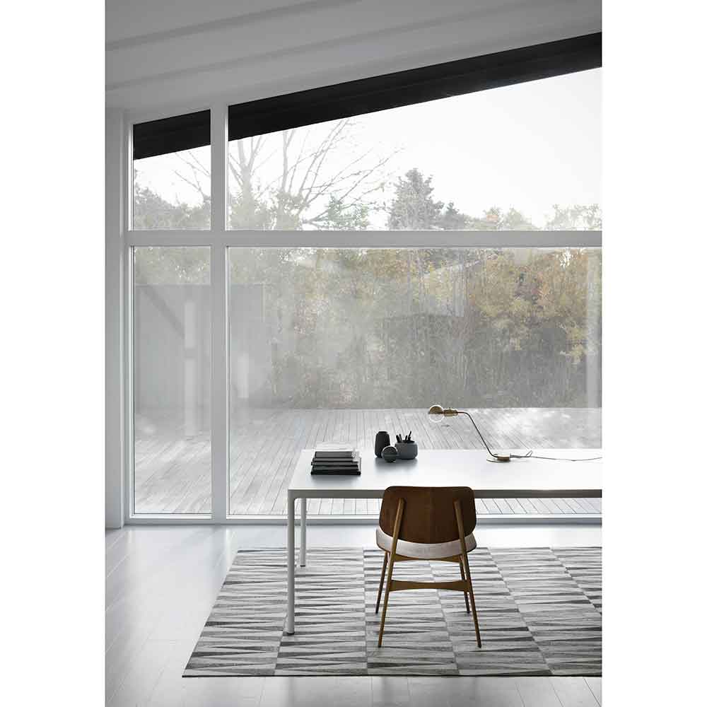 The Opal Rug is constructed from tiles of cowhide leather, woven into a geometric pattern. The seamless weave is perfectly smooth and soft underfoot. This rug is non-reversible and for indoor use only.