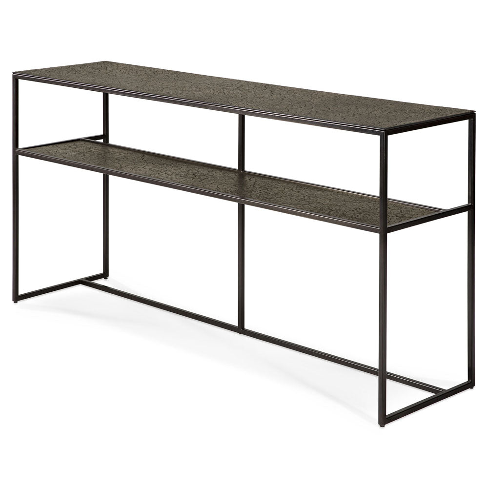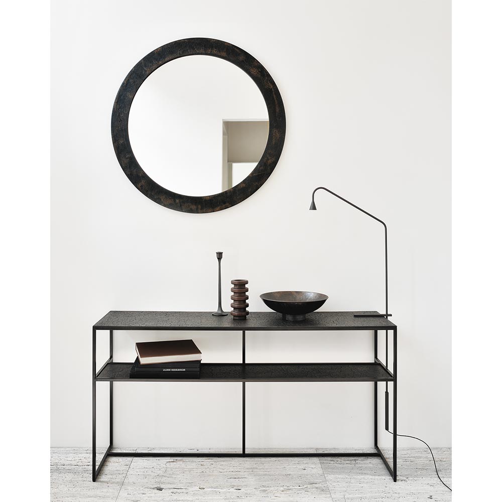 Relying on some of the oldest artistic ancestral techniques, the Pentagon Console Table's surface is shaped by skilled artisans. Natural mineral powders and color pigments blend to form the unique finish. The receded lower shelf set against the thickness of the top makes for a revealing graphic contrast against the openness of the base. Clean lines and a standardized height showcase the simple beauty of the metal work.