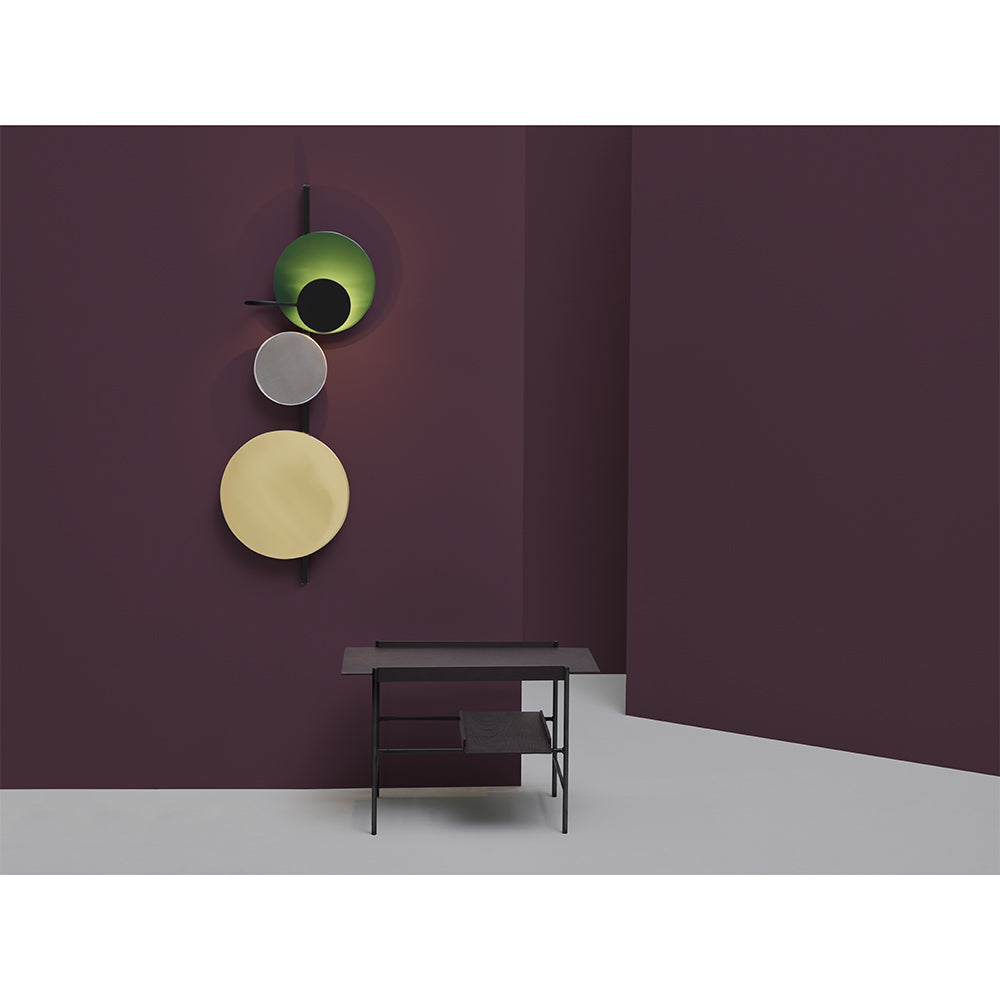 The idea of the Planet Lamp is that you can interact with the design. The circular discs are attached by magnetism and can freely be moved around. This means that you can change the visual images of the light as you wish. The indirect ambient light appears soft and creates shadows on the wall according to how the discs are configured on the profile.