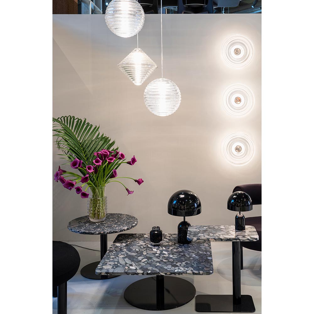 Press is a series of lights made from the thickest and most transparent glass with a satisfyingly rounded linear surface detail. The ribbed glass creates diffusion of the light source and projects linear and stripy patterns. The metal dome cap can be interchanged depending on the customer's color preference - silver, gold and black caps are included with the surface lights.