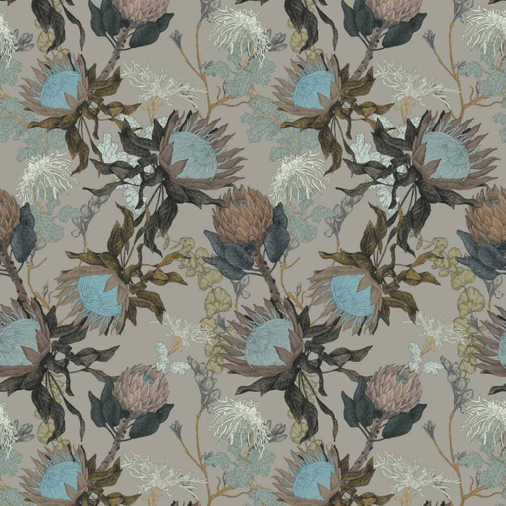 Proteas' Dream is an invigorating multi-hued wallcovering produced by 17 Patterns in collaboration with Siberian born illustrator Rina Vakuleva. Representing strength, hope and change; her adventurous floral debut takes its inspiration from the great myth and mystery of one of earth's oldest flowers, the King Protea. Comparable to the impressive scale of the Sugar Bush, striking hand-drawn illustrations flaunt their exotic petals and voluptuous artichoke-like blooms over a vibrant one meter pattern repeat. Deeply rooted within the fabric of this fictional composition is the daring nature, uniquely inherited from Vakuleva's early creative upbringing in the vast and rugged terrain of the Altai Mountains. The versatility of Proteas' Dream indulges even the boldest of floral fantasies. Instantly transforming both modern and traditional interiors across five fascinating color palettes of Cream, Pink, Duck Egg, Conure Blue and Woodland Gray.