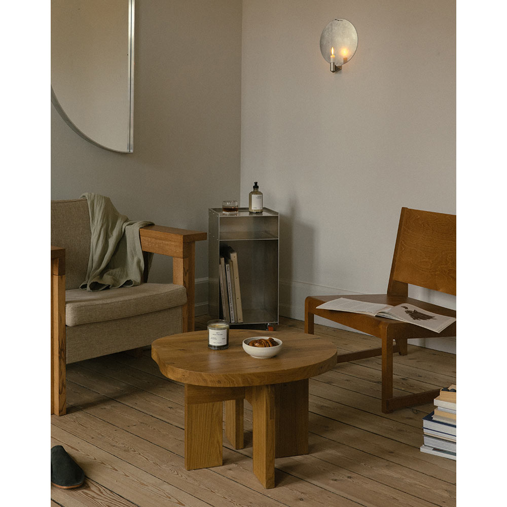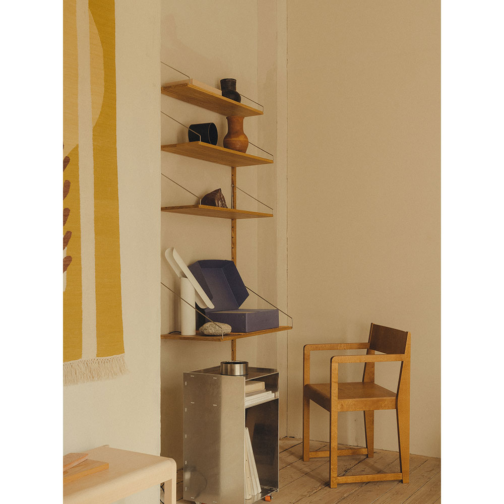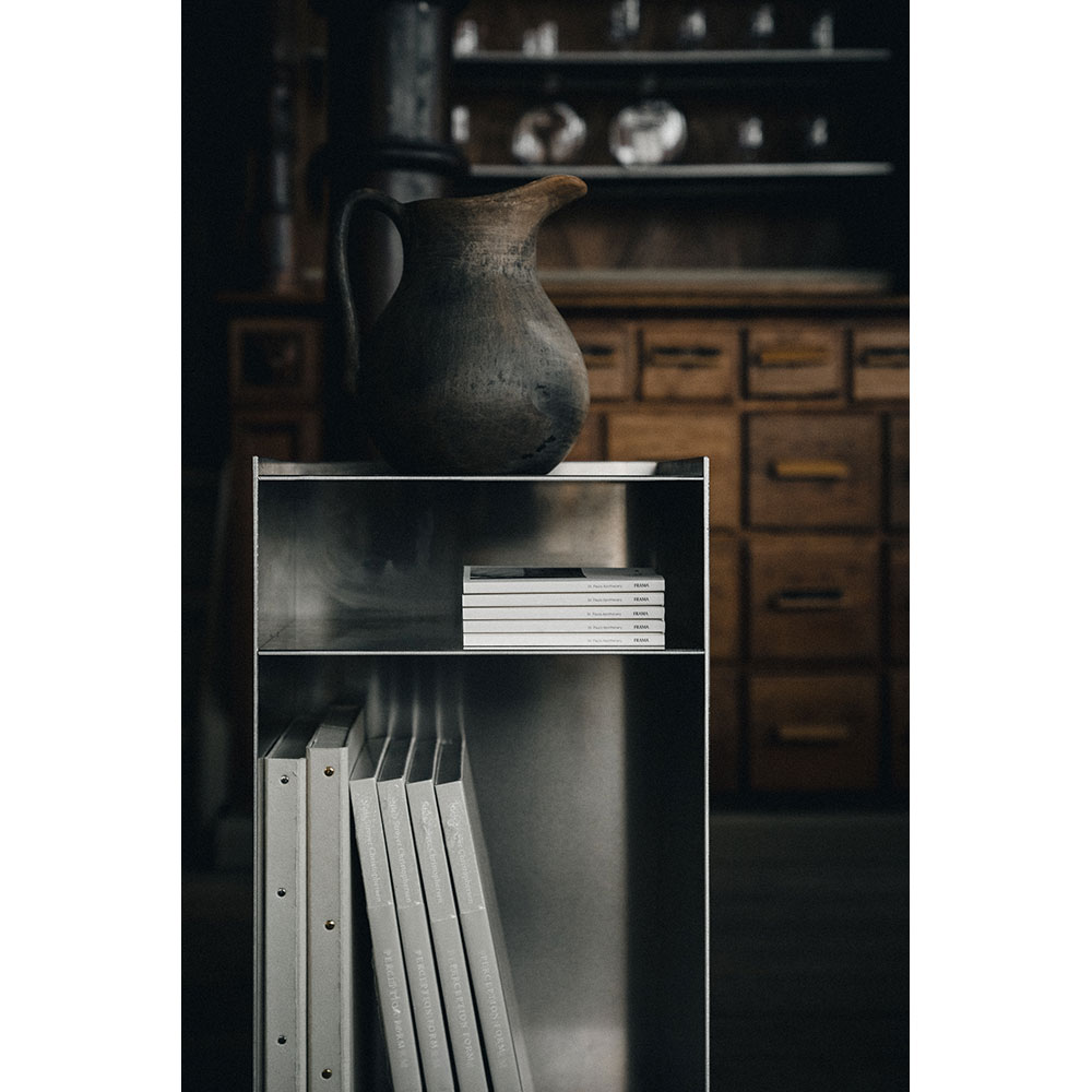 Rivet Cart is a raw aluminum storage piece with hand-hammered rivets on bright orange wheels - an elegant and versatile addition to FRAMA's Rivet Series. The easy-to-transport mobile cart features a tray-top with two open shelves below, combining traditional furniture craftsmanship and modern industrial production. Thanks to its sturdy construction, this timeless piece can be used as a table, storage unit, pedestal for display, or a combination of all three.