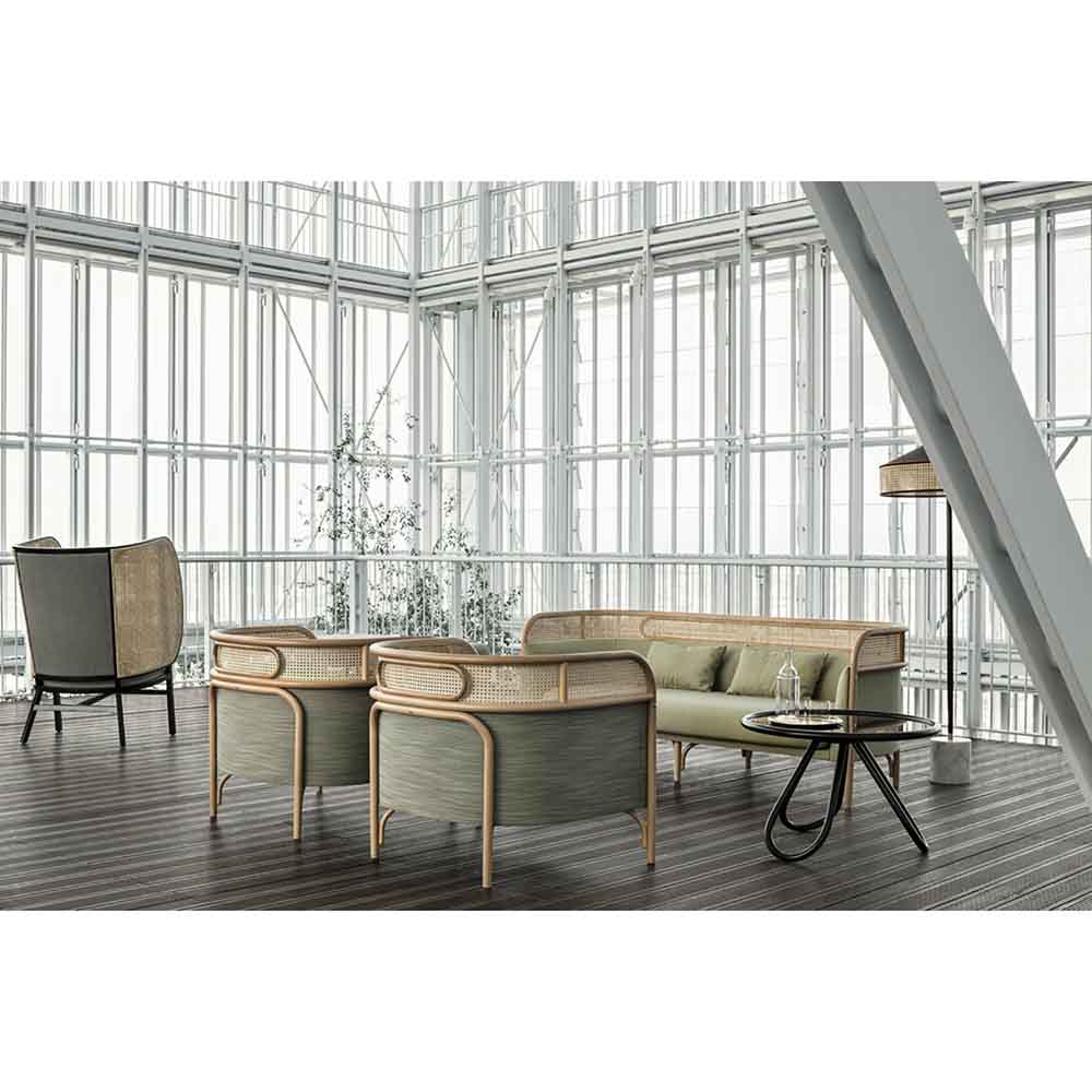 Wiener GTV Design's collection of upholstery suggests a new concept of comfort designed by GamFratesi, the Italian-Danish designer duo Stine Gam and Enrico Fratesi. The bent beech structure holds the wide seat cushion and the upholstered backrest has a woven cane edge with an eliptical element, the plate (targa), after which the design is named. Also available with brass feet. Targa Sofa perfectly fits public spaces designed for an intimate and secluded atmosphere, as well as non-conventional residential environments.