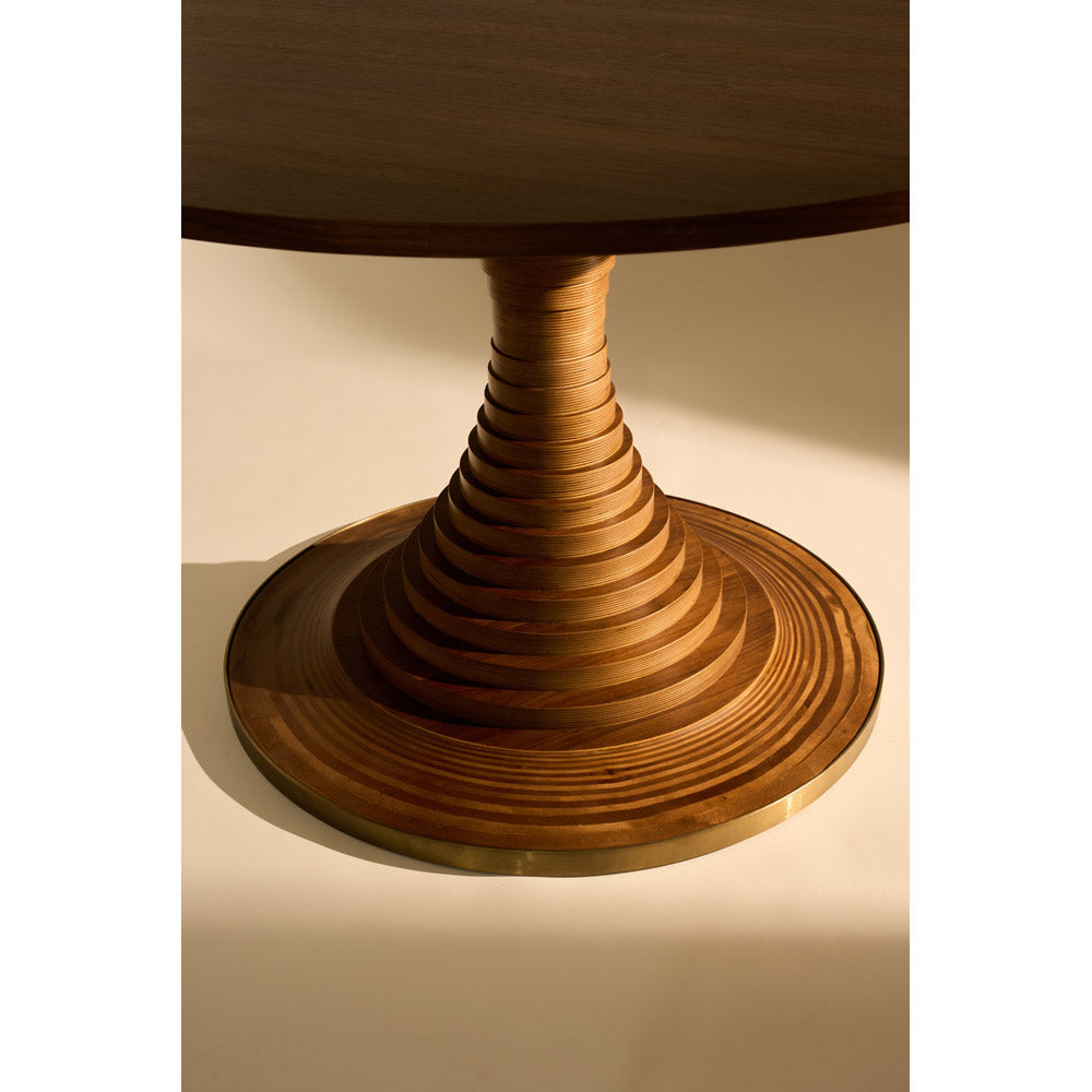 Designed in 1963 by Italian architect Carlo De Carli, the Tavolo a Dischi Dining Table is a study in structural ingenuity and refined materiality. The round table is crafted from 1.2" walnut-veneer birch plywood discs, stacked in varying diameters around a concealed metal core to form a graceful curve that supports the expansive walnut-veneer top. All wood components are FSC-certified and responsibly sourced.