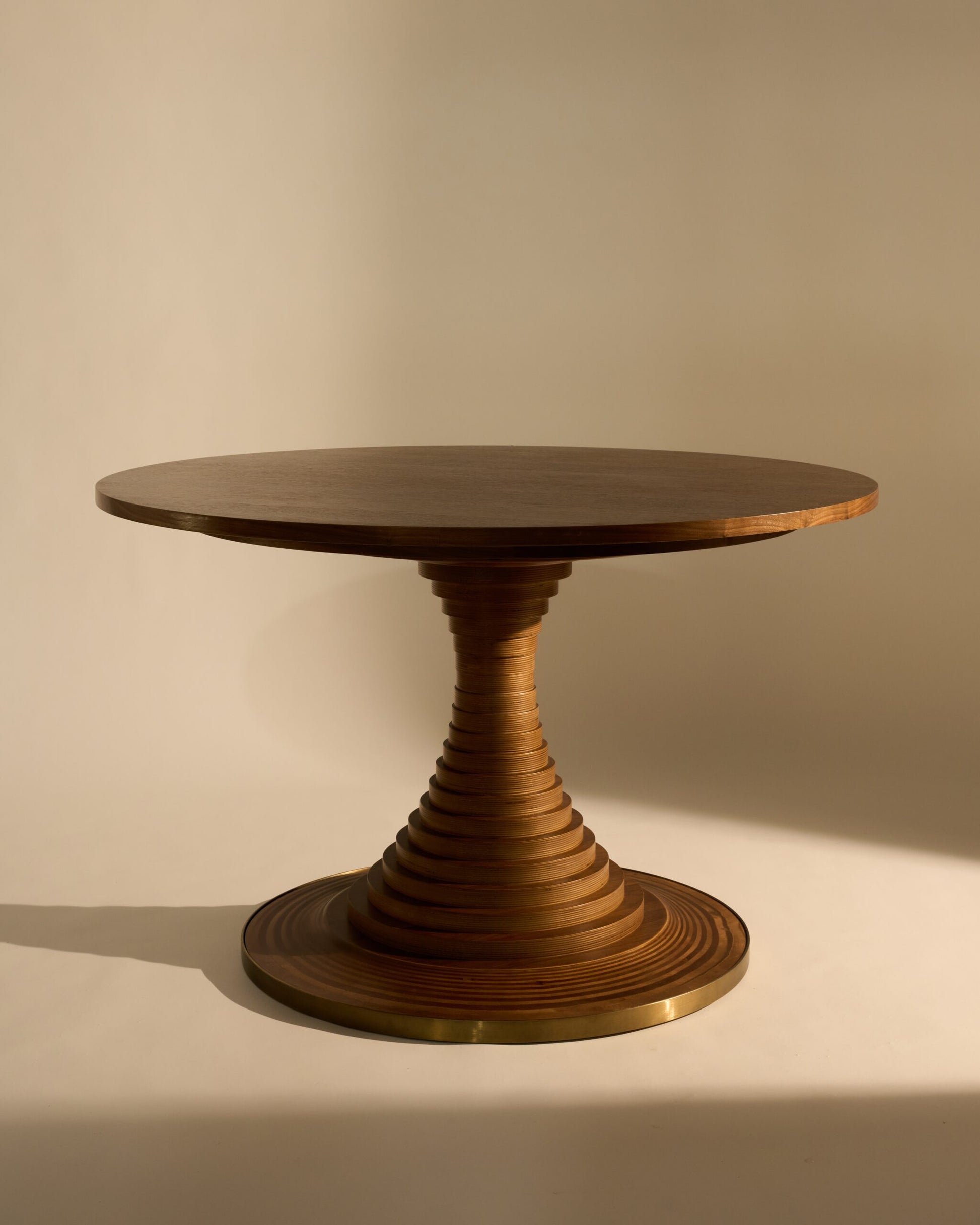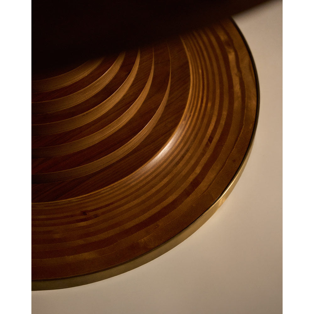 A burnished brass-toned steel band anchors the base, introducing a subtle contrast while enhancing durability. Available in two sizes, Tavolo a Dischi functions as both dining table and meeting place. It is a sculptural centerpiece designed to foster connection and conversation.