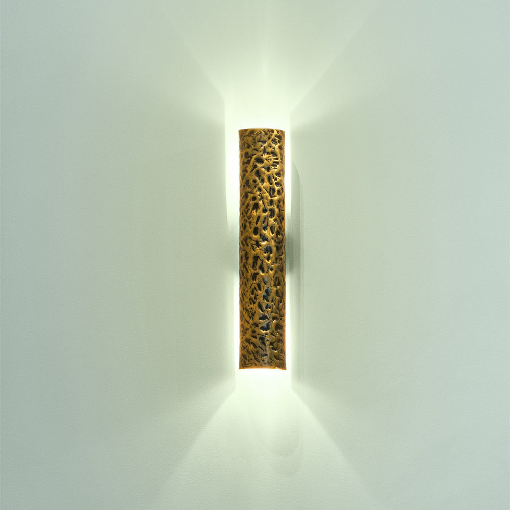 Tree Branches Wall Lamp recreates the sunbeams that pierce the density of forests. The light appears on a secondary plan, brightening the wall around it. The clean lines of this stylish piece are decorated by a handmade hammered technique using special tools. As if we are closely looking to a single branch that hides us from the sunlight while we stand in its shadow. Produced with the quality and expertise of InsidherLand team of Portuguese artisans, the Tree Branches Wall Lamp is entirely handmade and each piece becomes truly unique.
